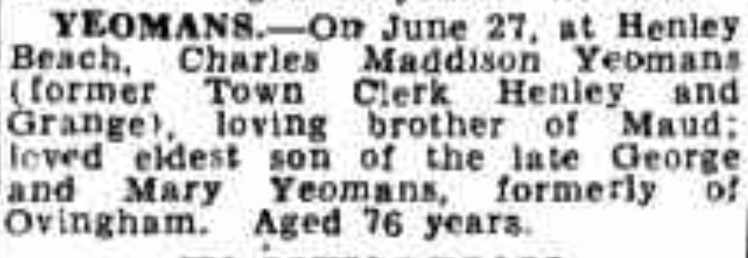Sadly, his health continued to decline and Yeomans died at his family home in Prospect, on the 27th of June 1948. He was buried at the North Road Cemetery, and on the day of his funeral the Henley and Grange Town Hall flag flew at half-mast in his honour.
