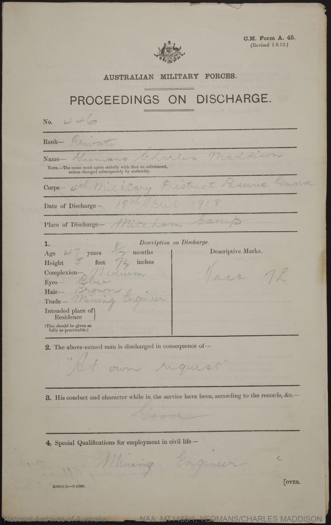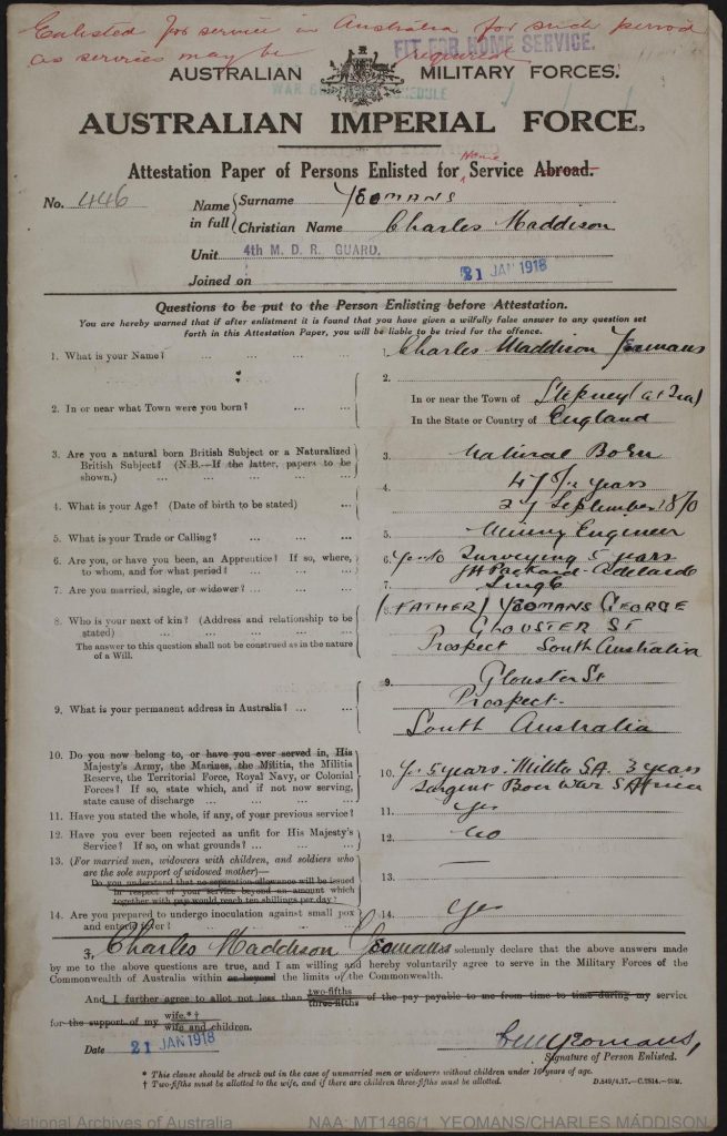 National Archives of Australia, Charles Maddison Yeomans Wold War I Enlistment Records, Retrieved October 16, 2025, https://recordsearch.naa.gov.au/SearchNRetrieve/Interface/ViewImage.aspx?B=60234993