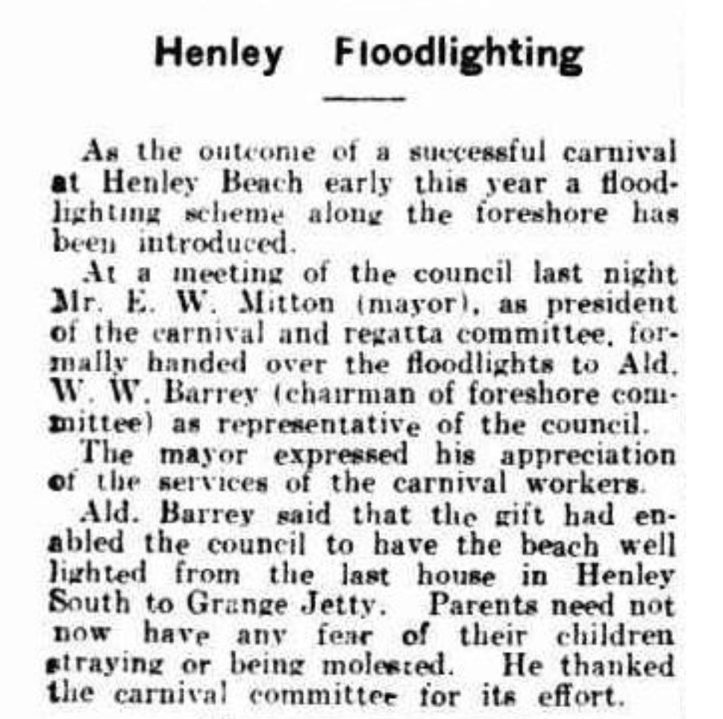 Henley Floodlighting (1930, December 17). News (Adelaide, SA : 1923 – 1954), p. 10 (HOME EDITION). Retrieved October 16, 2025, from http://nla.gov.au/nla.news-article128955192