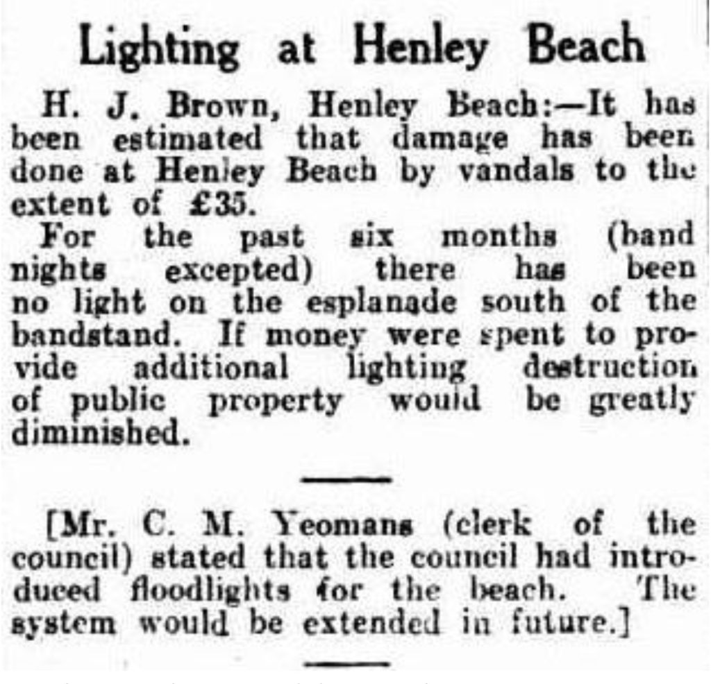 Lighting at Henley Beach (1928, November 21). News (Adelaide, SA : 1923 – 1954), p. 6 (HOME EDITION). Retrieved October 16, 2025, from http://nla.gov.au/nla.news-article129020683