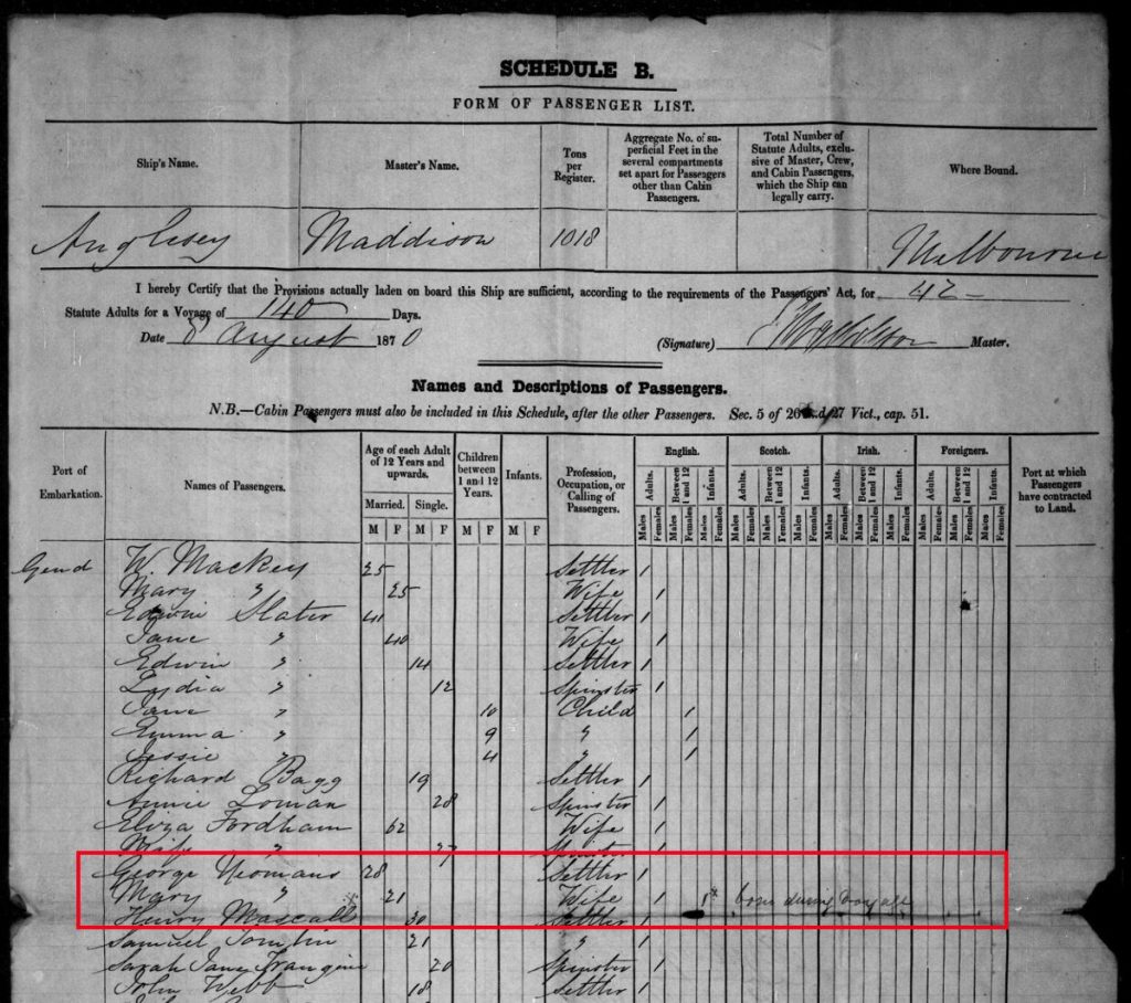 Public Record Office Victoria, Inward Overseas Passenger Lists, VPRS 947/P0000, Sep – Dec 1870, https://prov.vic.gov.au/archive/3B3D2DF1-F96C-11E9-AE98-E9BFA8524AEB?image=150