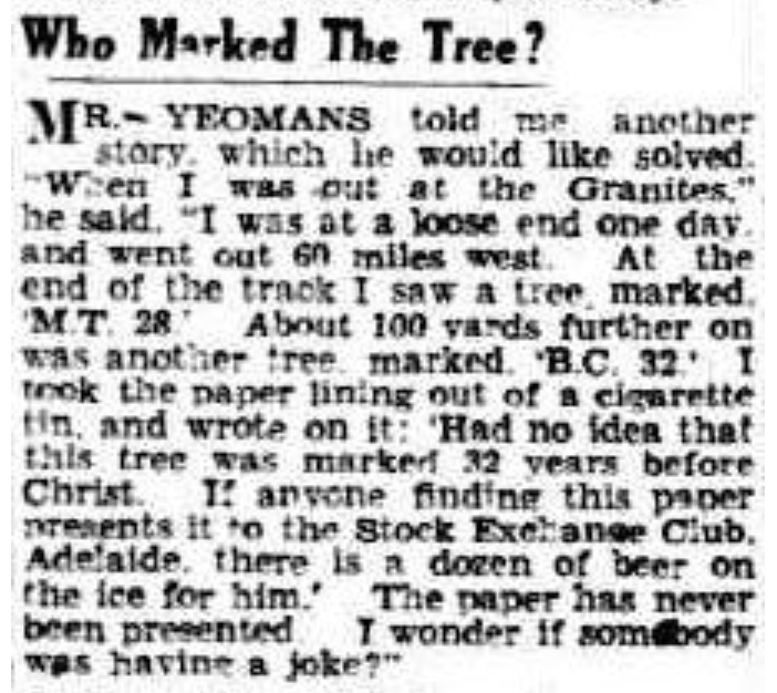 A story from this period reveals a lighter side to his personality. On one occasion, while working in the remote ‘Granites’ region, he found a tree with a tin plate bearing the inscription “M.T. ’28.” Apparently, it had been left there by Michael Terry, the explorer. Nearby he found another piece of tin on a tree marked “B.C. 32,” which he believed was left by a cynical prospector. Seeing the humorous side of the situation, Yeomans marked on a paper from his cigarette tin that he “had no idea the tree was marked 32 years before Christ” and that if the finder of his message called at the Stock Exchange Club in Adelaide, he would find “a dozen bottles of beer awaiting him on ice”. The beer was never claimed.