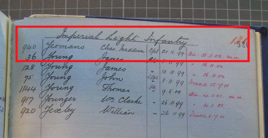 Boer War Listing for C.M. Yeomans – Imperial Light Infantry