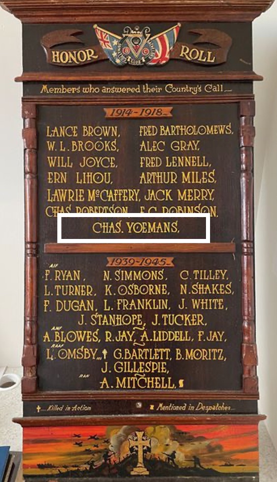 National Archives of Australia, Charles Maddison Yeomans Wold War I Enlistment Records, Retrieved October 16, 2025, https://recordsearch.naa.gov.au/SearchNRetrieve/Interface/ViewImage.aspx?B=60234993