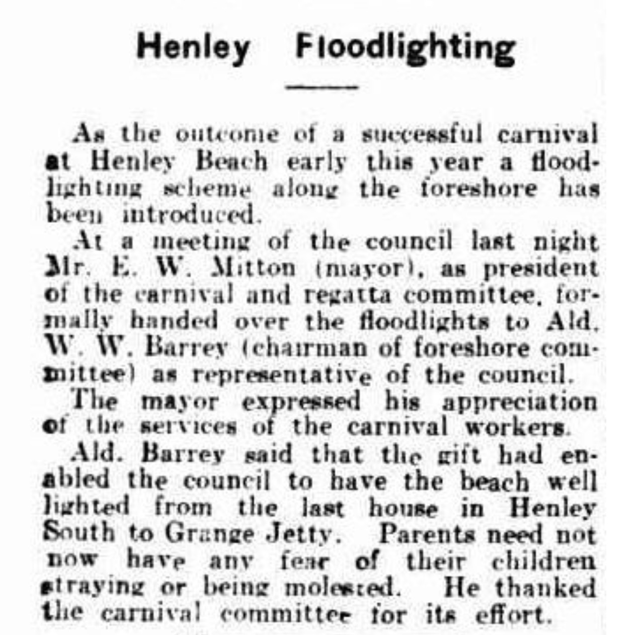 Henley Floodlighting (1930, December 17). News (Adelaide, SA : 1923 – 1954), p. 10 (HOME EDITION). Retrieved October 16, 2025, from http://nla.gov.au/nla.news-article128955192