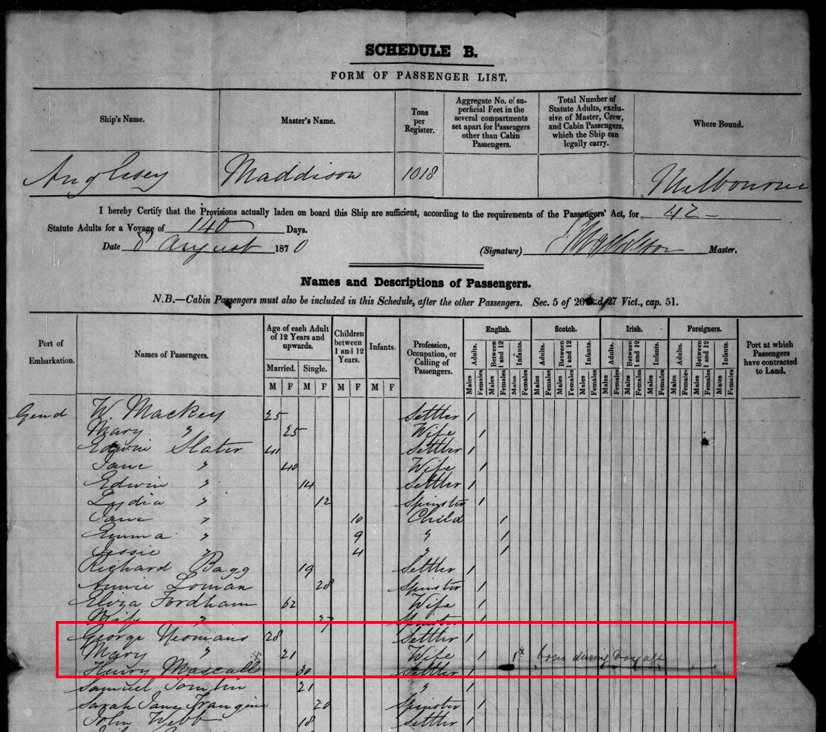 [Area highlighted shows George and Mary Yeomans and records the ‘birth of a male during voyage’