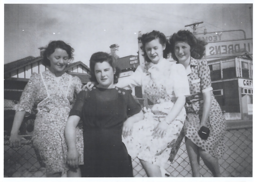 Young women on a fence, with the Yeomans gates just behind c. 1926