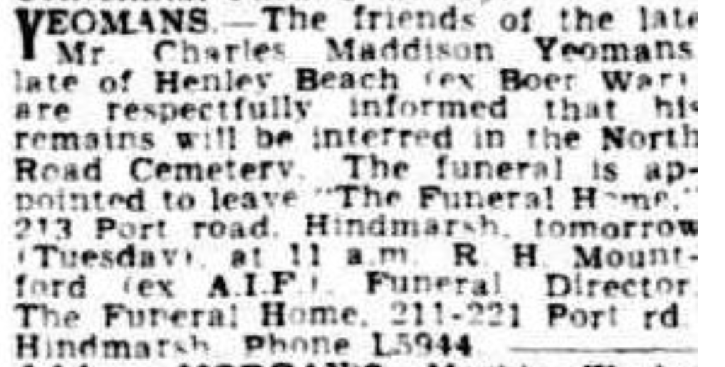 Sadly, his health continued to decline and Yeomans died at his family home in Prospect, on the 27th of June 1948. He was buried at the North Road Cemetery, and on the day of his funeral the Henley and Grange Town Hall flag flew at half-mast in his honour.